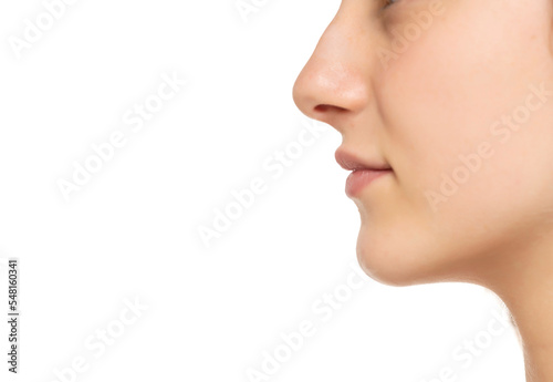 © vladimirfloyd, Obraz premium Closeup profile of female s nose and lips with no makeup on a white background