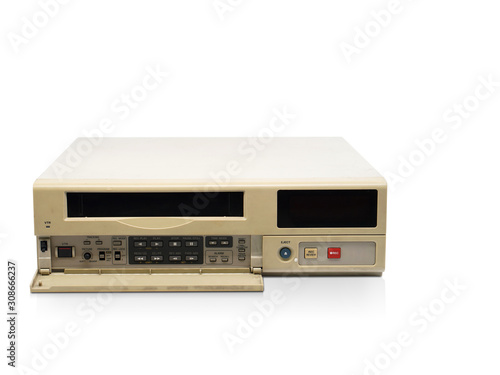 Obraz premium Closeup Push button old video tape player on white background, object,...