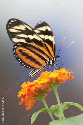 Fototapeta premium Closeup shot of a beautiful butterfly perched atop a long stem floral bloom