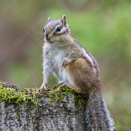 © Woodhicker_shots1/Wirestock Creators, Naklejka premium Closeup shot of a cliff chipmunk on a mossy stump.