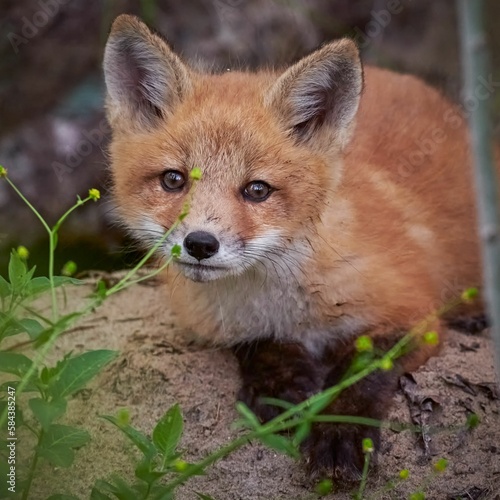Fototapeta premium Closeup shot of a cute fluffy baby red fox in a forest