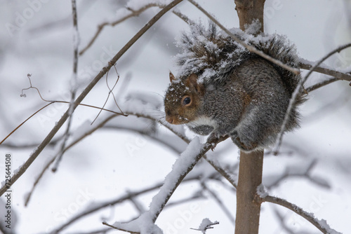 Obraz premium Closeup shot of a fluffy snowy squirrel on a tree branch