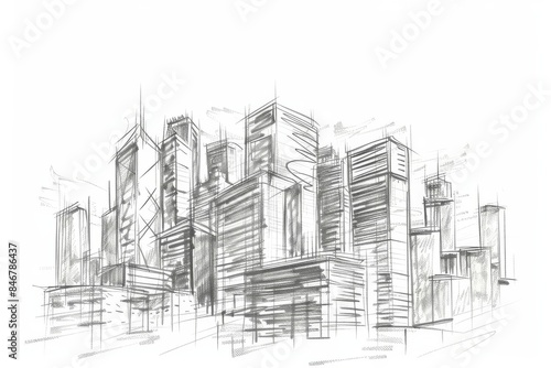 © BeblackDesign, Fototapeta premium Closeup shot of a handdrawn sketch of a cityscape on a pure white background, ideal for art displays and creative portfolios