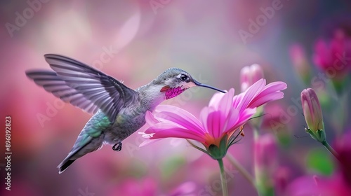 © Bonnie, Naklejka premium closeup shot of a hummingbird feeding from a pink flower showing its long beak and iridescent feathers