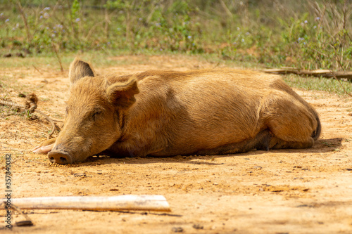 © Lukas, Fototapeta premium closeup shot of a pig sleeping on the soil enjoying the sun