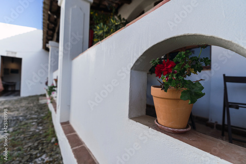 © MiguelAngelJunquera, Fototapeta premium Closeup shot of a potted flower on a white wall of a house