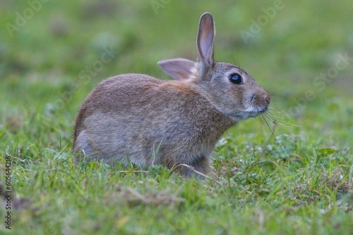 Fototapeta premium Closeup shot of a rabbit sitting on grass against blur background