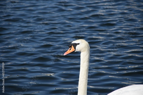 Naklejka premium Closeup shot of a white swans head swimming in a dark blue lake