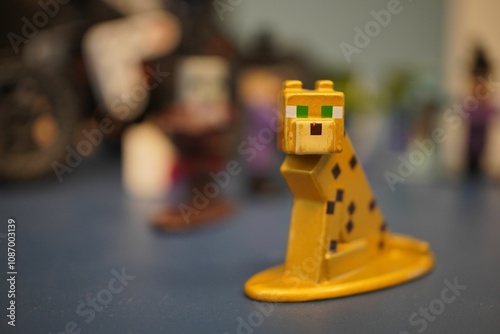 © Everyday Frame, Naklejka premium Closeup shot of a yellow metal Minecraft cat figurine toy