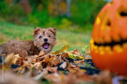 © Khlphoto/Wirestock Creators, Obraz premium Closeup shot of a Yorkshire Terrier dog playing with autumn leaves outdoors and a Halloween pumpkin