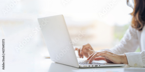 © itchaznong, Fototapeta premium Closeup shot of hands using laptop and typing on keyboard, searching information