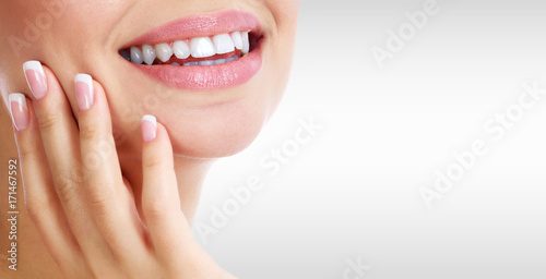 © Nobilior, Fototapeta premium Closeup shot of woman's toothy smile against a grey background with copyspace