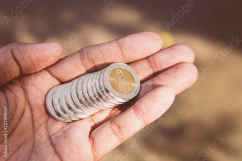 © jaturonoofer, Fototapeta premium Closeup stack coins of Thai baht on hand