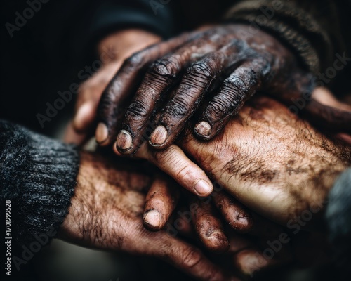 © Alam, Fototapeta premium Closeup Stacked Dirty Hands Showing Unity