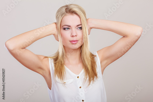 Fototapeta premium Closeup stressed business woman covers ears with hands