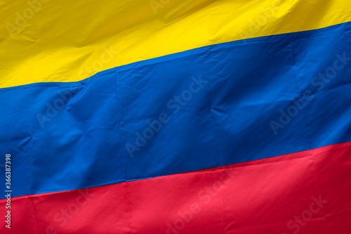 © Alejandro Bernal, Naklejka premium Closeup to a Colombian flag waving with the wind. Nationality and country concept