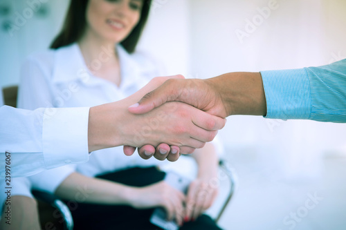 Obraz premium closeup. Two multicultural businessmen handshaking over desk