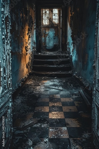 Obraz premium Closeup vertical shot of a decrepit corridor, broken windows, and collapsed...