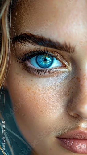 © Aldidua, Fototapeta premium Closeup Vibrant Blue Eye with Glitter Makeup