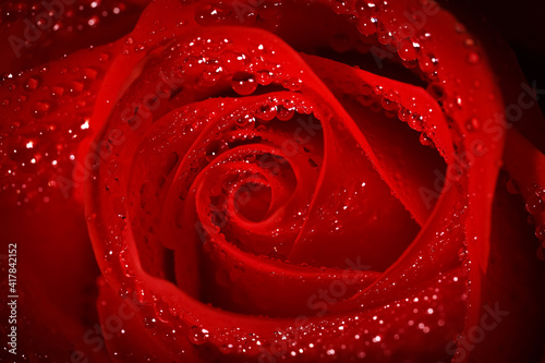 © New Africa, Naklejka premium Closeup view of beautiful blooming red rose with dew drops as background
