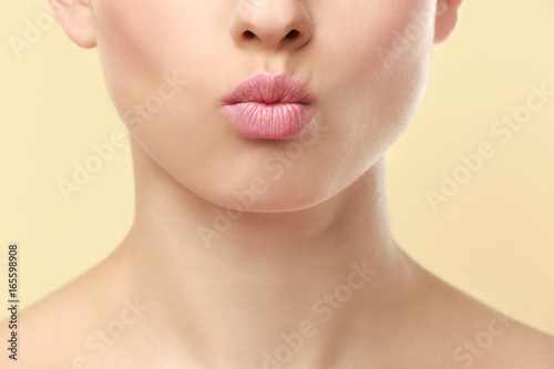 Obraz premium Closeup view of beautiful young woman with natural lips makeup on color...