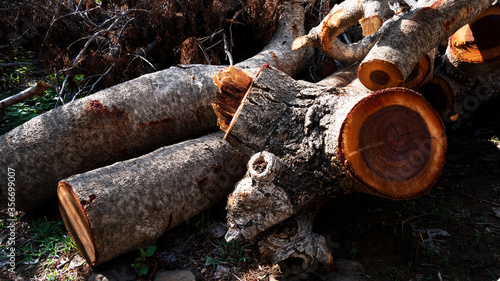 Fototapeta premium closeup view of end face logs gathering timber yard