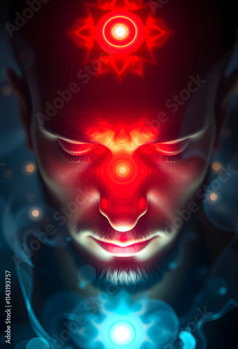 © SusDmi, Fototapeta premium Closeup view of man and chakra points. Healing energy, dramatic atmosphere, with white tones