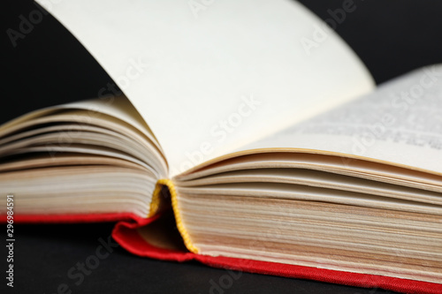 © New Africa, Fototapeta premium Closeup view of open book on black background