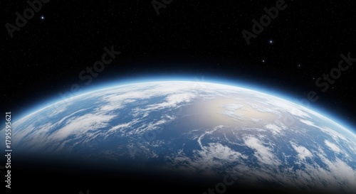 © siam, Obraz premium Closeup view of planet earth from orbit, showcasing the curvature of the planet, clouds, and oceans, with a dark starry sky in the background, evoking a sense of awe and perspective