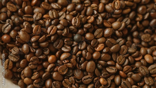 © Krakenimages.com, Naklejka premium Closeup view of roasted coffee beans forming a rich and aromatic texture, ideal for a fresh brew or coffee-related themes in culinary and beverage contexts