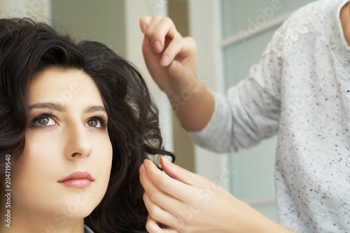 Fototapeta premium Closeup view of the hand and comb of a hairstylist combing a new hairstyle on...