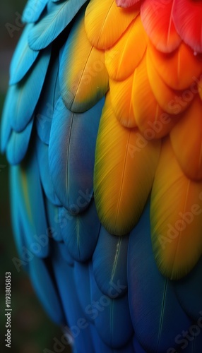 Fototapeta premium Closeup view of vibrant toucan feathers. Colorful plumage with vibrant hues of blue yellow, red. Feathers soft texture. Exotic tropical bird. Beautiful design pattern for background wallpaper