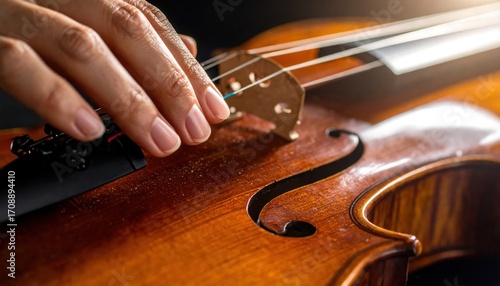 © afriza, Fototapeta premium Closeup Violinists hand plucking strings on wooden violin.