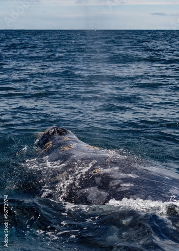 © S Stelmakhovich, Obraz premium Closeup Whale Swimming At Ocean showing blowhole and skin covered with balanuses and vibrissas. Gray whale migrating in blue ocean waters of Mexico. Unique photo of mammal animal. Crustaceans on skin