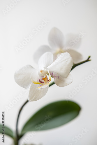 © Yevhenii Khil, Obraz premium Closeup white orchid Phalaenopsis Adelaide on a white background. blur and selective focus. Vertical photo
