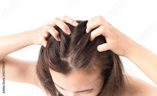 Naklejka premium Closeup woman hand itchy scalp, Hair care concept