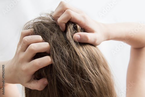 Naklejka premium Closeup woman hand itchy scalp, Hair care concept