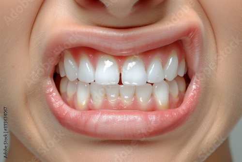 © Nathasa, Fototapeta premium Closeup women smile showing white tooth with empty background. Dentist care concept.
