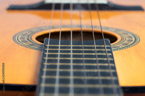 Obraz premium Closeup wooden classical guitar. Old classical guitar with nylon strings. Old acoustic guitar