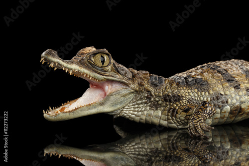 © seregraff, Naklejka premium Closeup Young Cayman Crocodile, Reptile with opened mouth Isolated on Black Background, Side view