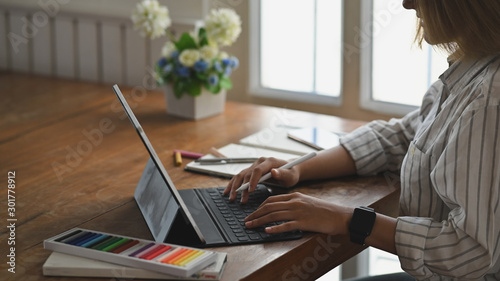 © Prathankarnpap, Fototapeta premium Closeup young female typing digital tablet.
