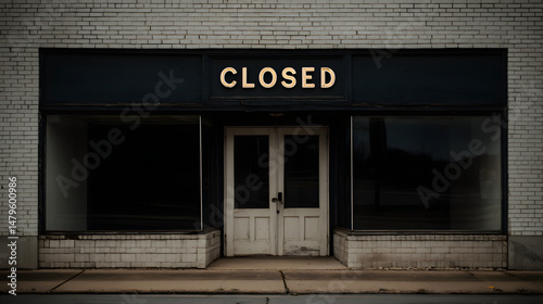 © Nikola, Obraz premium Closing Storefront Sign Illustrates Retail Business Downturn Economic Recession Impact Small Business Struggles Financial Crisis Symbolism Empty Shop Window Commerce Challenges