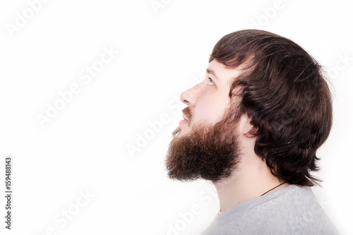 © traza, Obraz premium Clothed in confidence. Profile of young bearded man standing against white background