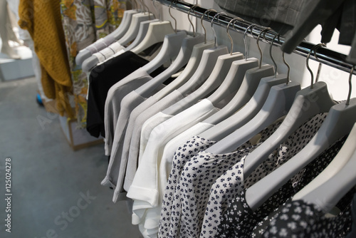 Fototapeta premium Clothes hang on a shelf in store