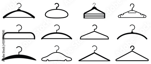 Fototapeta premium Clothes hanger icon. Set of clothes hanger vector icons. Hanger for cloakroom or closet. Hang for coat, shirt or suit. Clothes hanger silhouette collection. Clothing and Wardrobe Vector Icons