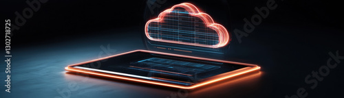 Obraz premium Cloud based file storage concept. Digital cloud concept above a tablet with glowing effects and data visuals.