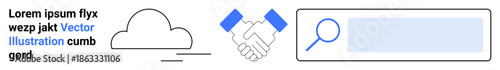 © robu_s, Obraz premium Cloud computing, communication tools, teamwork, partnerships, digital search, collaboration. Minimalist icons with a cloud, handshake and search interface. Cloud computing and communication tools