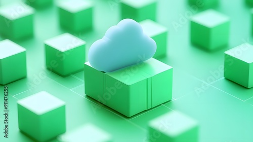 © Tackey, Obraz premium Cloud computing concept with a 3D cloud icon over green blocks, illustrating data storage, digital technology, and tech infrastructure.