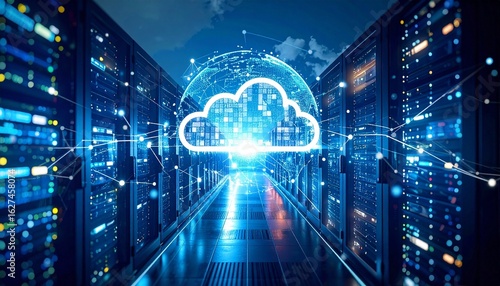 Obraz premium Cloud computing infrastructure with global connectivity, central cloud icon surrounded by digital app symbols, server racks in background, blue