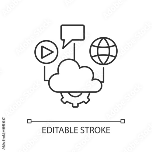 © IMG visuals icons, Obraz premium Cloud computing linear icon. Files storage and sharing. Computing services delivering. Thin line customizable illustration. Contour symbol. Vector isolated outline drawing. Editable stroke